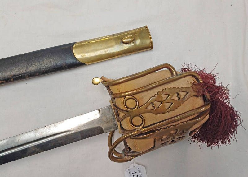 20th century brass hilted basket hilted broadsword with its 81.5cm long double edged blade, brass hilt & its leather & metal scabbard