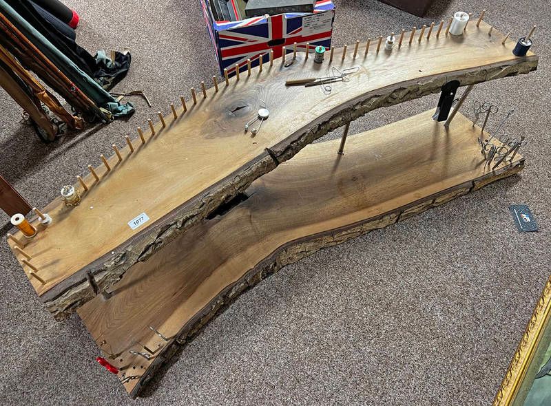 2 tiered fly tying station made of wood with an assortment of tools, 126cm long