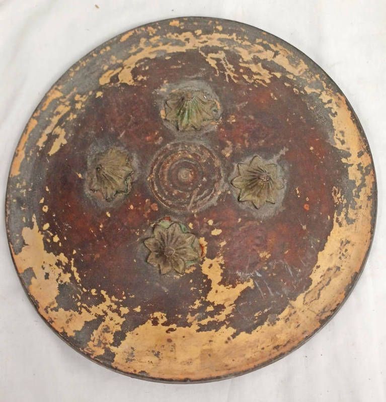 Indo persian shield (dhal) with characteristic painted hide construction with 4 metal bosses, central roundel & iron suspension hoops to rear, 34cm across
