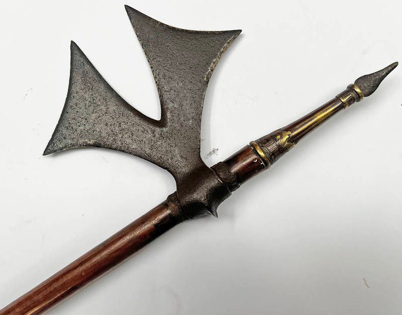 Indian bulova axe with unique shaped head with 4 points, iron & brass tip to the wooden shaft, 87cm long