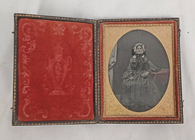 19th century leather cased ambrotype / daguerreotype of a eldery victorian lady in a dress with pink highlights to her head
