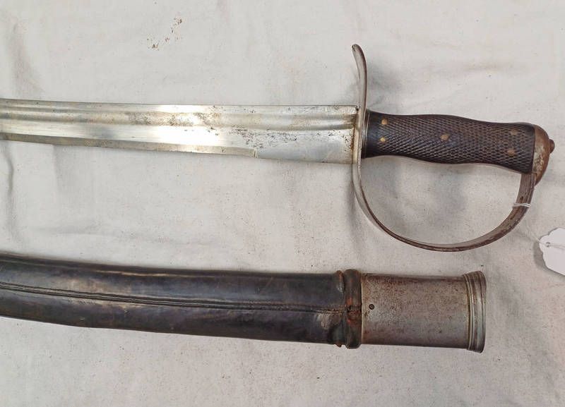 Late 19th century cavalry sword with 81cm long curved blade etched with crescent design to either side of the blade, characteristic hilt with chequered wooden grip & its leather metal mounted scabbard