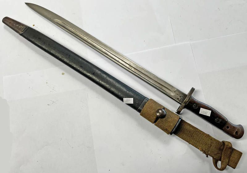 1907 pattern bayonet by wilkinson the 43cm long blade marked to ricasso and dated 6,18 with its scabbard and canvas frog