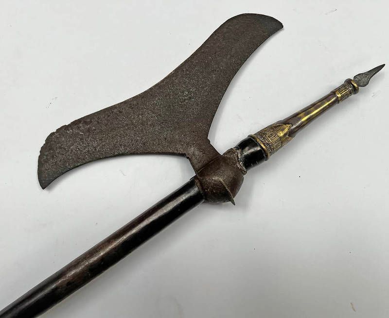 Indian bulova axe of characteristic form with 24cm long head on a wooden shaft with iron & brass tip/point