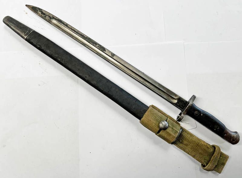 British 1907 pattern bayonet by sanderson with 42.8cm long blade dated 10, 16, with several other markings, characteristic grip with scabbard & canvas frog