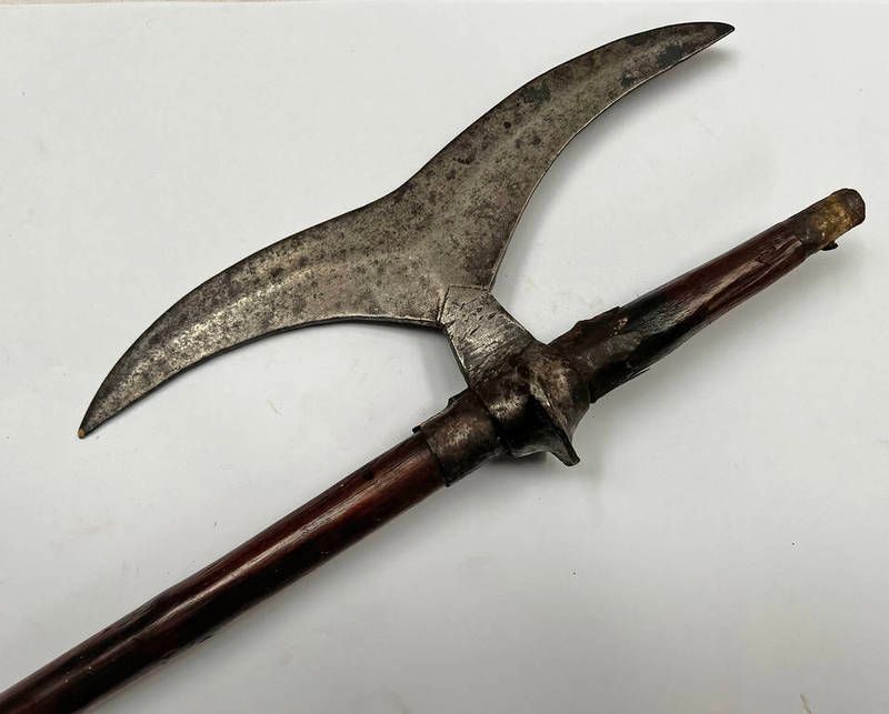 Indian bulova axe of characteristic form with 28.5cm long head on a wooden shaft (missing tip)
