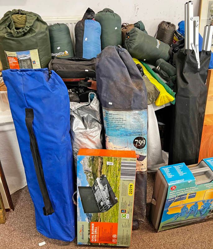 Large selection of camping related items and gear to include tents, sleeping bags, binoculars, gas stove etc