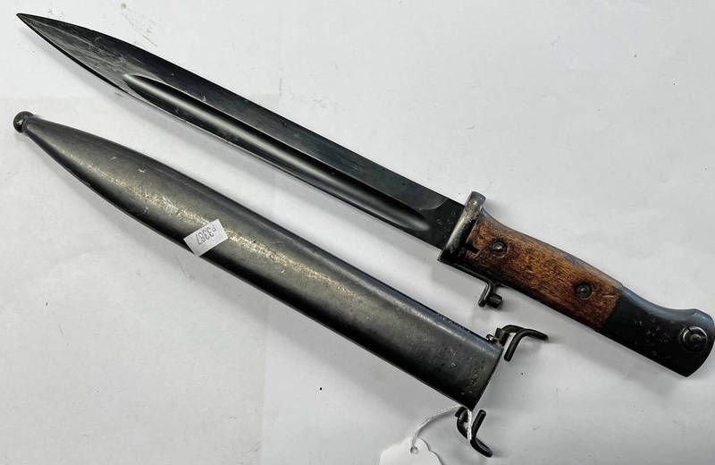 Ww2 german 98k bayonet modified to fit a m1 garand, the 25cm long blackened blade marked coppel embh with its steel scabbard