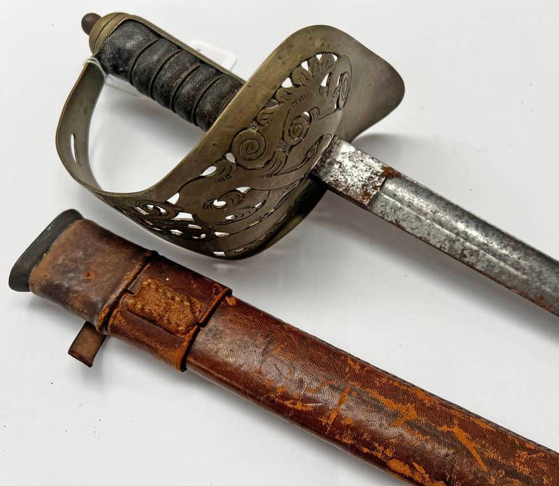 British infantry officers sword with 1845 pattern blade fitted to a 1897 pattern hilt, blade with markings to spine & the leather covered scabbard