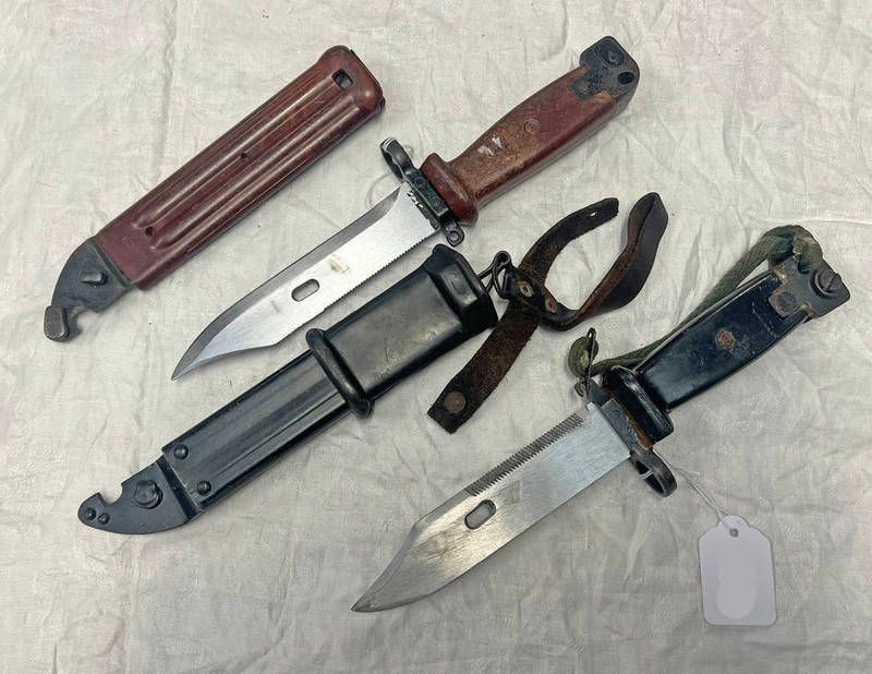 Two akm knife bayonet variants, both with 14cm long blades with characteristic hilts and scabbards