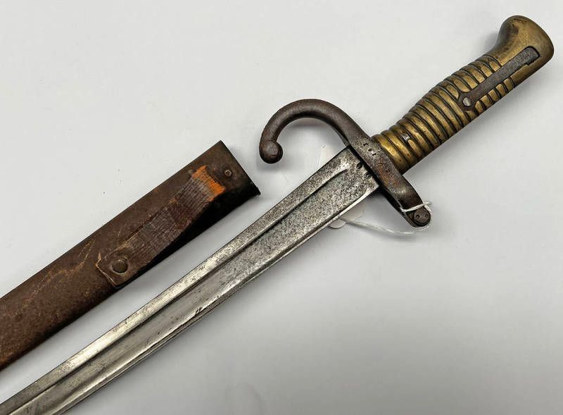 French 1866 chassepot bayonet with 57cm long blade with markings to spine, characteristic hilt with...