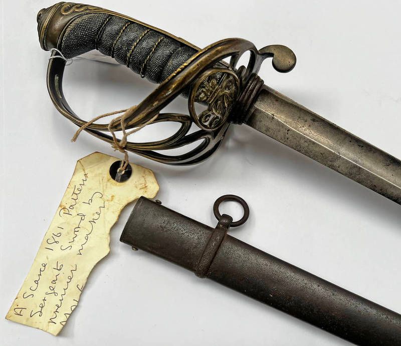 1861 pattern staff sergeants sword by mole with 81.5cm long blade with single fuller to either side & a spear point tip, hilt with vr cypher, fishskin grip with steel scabbard