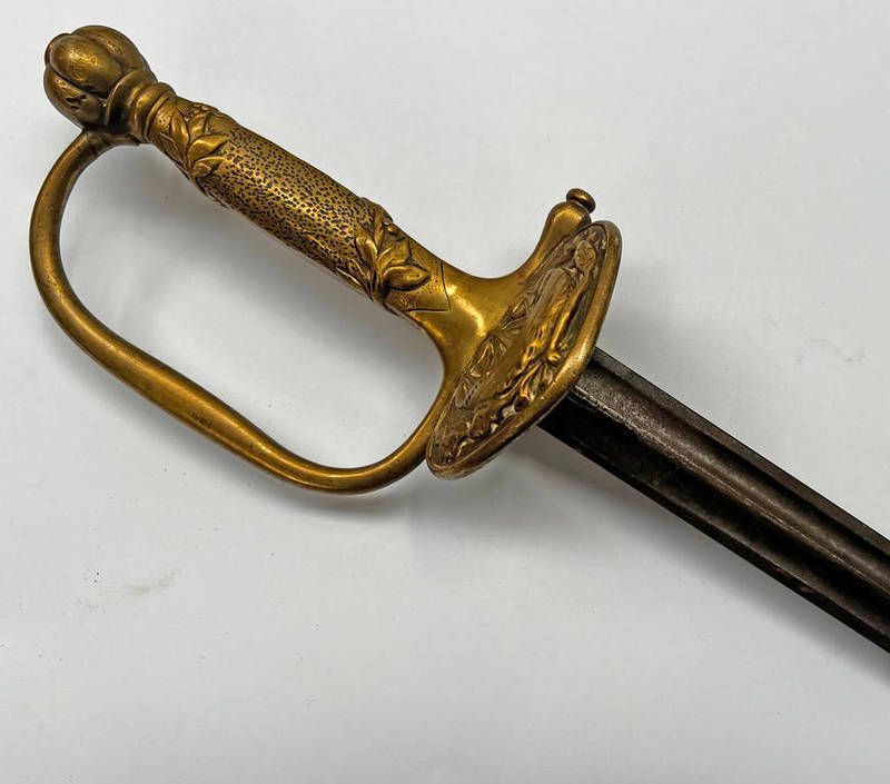 19th century paris fire brigade uniform sword with 30 inch straight double edge bi-fullered blade, cast brass hilt with large shell embossed with a sailing ship & floral decorated grip