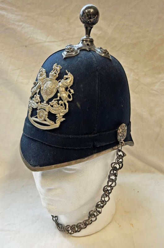 1st forfarshire volunteer artillery officers blue cloth helmet the cloth covered skull with white metal fittings, crowed royal arms helmet plate with regimental title, ball finial, chin chain, interior with leather head band & red silk liner with leather label 'regulation cork helmet'