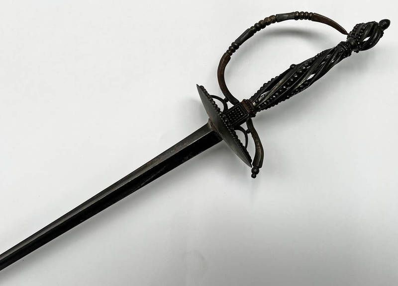 19th century court sword with 79.5cm long triangular slender blade with remains of etching, ovoid guard with beaded & twisted metal grip