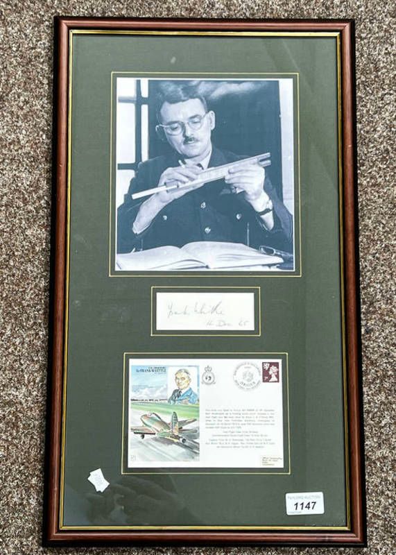 Air commodore sir frank whittle kbe, cb, frs, lld, framed signature dated 16 dec 65 along with photograph and cover with stamp