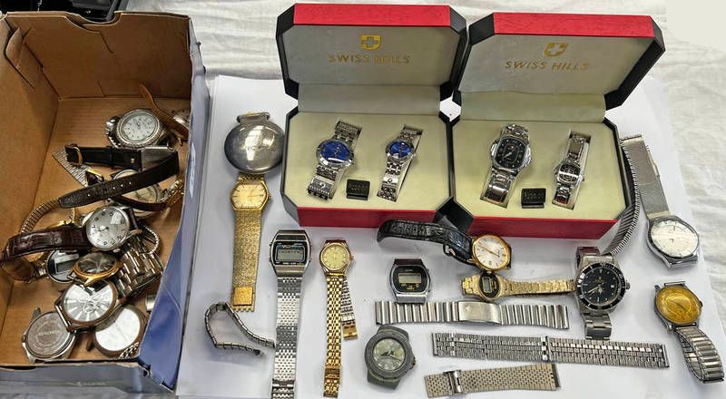 Selection of wristwatches to include 2 cased swiss hills wristwatches, simon carter, seiko, accurist, limit, benrex, etc in one box