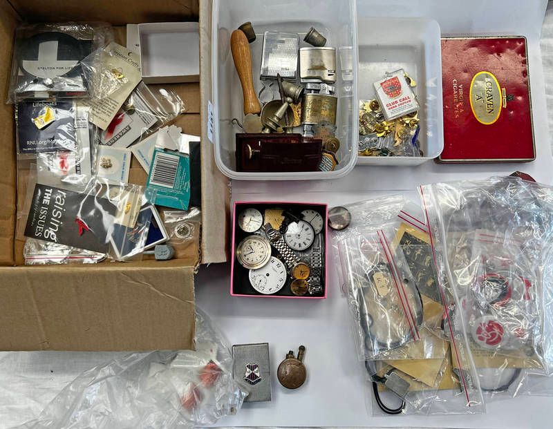Ephemera to include a silver cased pocket watch, pocket and wristwatch parts, ww1 era penny lighter, huntly crest match box cover, royal artillery badge, 19th canada maple badge, lighters, thimbles, badges etc in one box