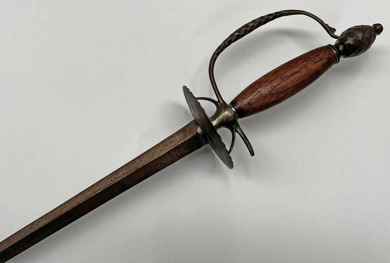 19th century court sword with 79.5cm long triangular blade, ovoid steel hilt, faceted guard & pommel with wooden grip