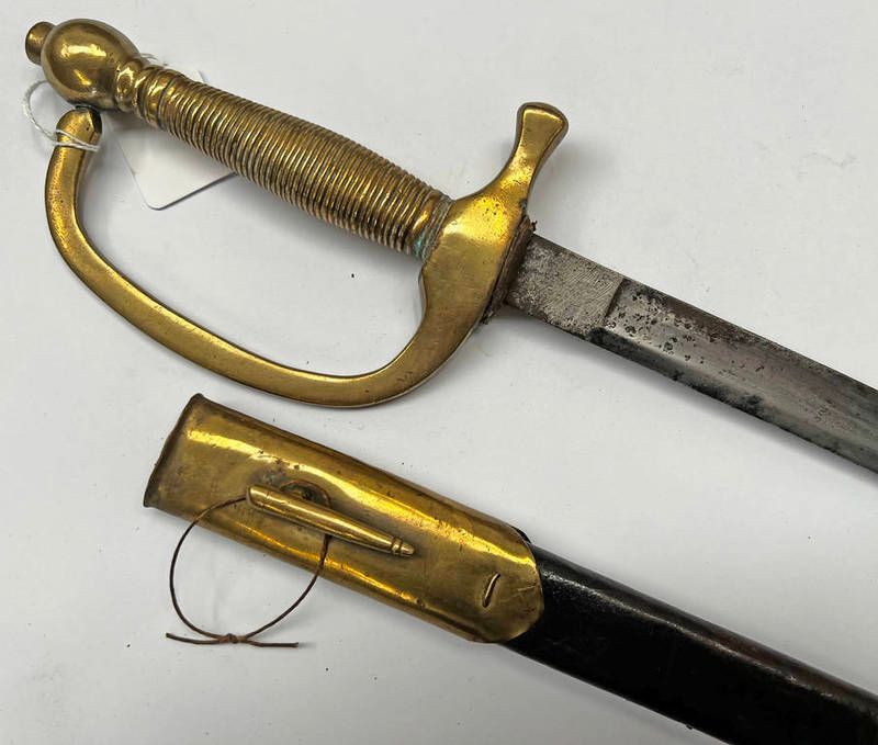 Us model 1840 musicians sword with 66 cm long single edge fullered steel blade, brass stirrup hilt with its brass mounted leather scabbard