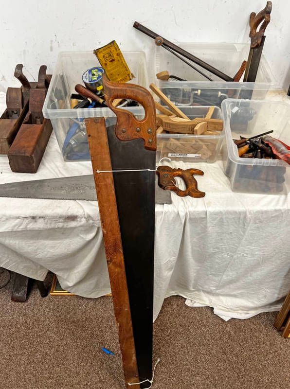 Large selection of various wood working tools to include a large hand saw, 42 1/2'' blade, tenon saw, various vintage chisels, wooden planes, shaves, braces, etc
