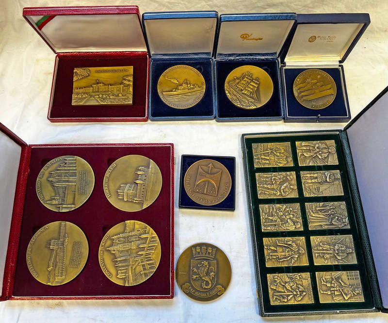 Selection of portugese bronze plaques to include portugal submarine, nrp sagnes, set of 4 portugese famous monuments medallions in a fitted case, 10 portugese historical figure medallions in a case etc