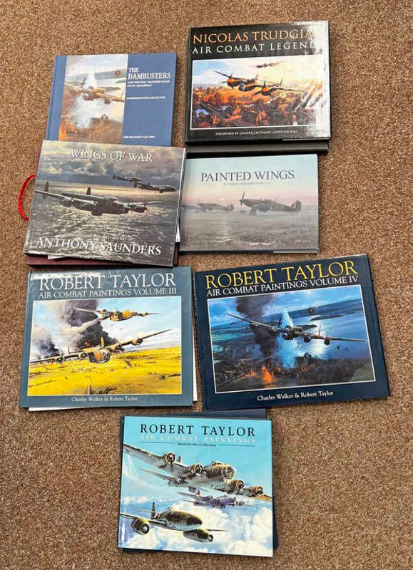 Robert taylor air combat paintings master works collection book 262 / 400, robert taylor air combat paintings volume iii and iv both with various airmen signatures to interior, anthony saunders wings of war, painted wings by aviation artist robin smith with signatures, the dambusters with signatures to interior and nicolas trudgian air combat legends 516 / 650 with signatures to interior