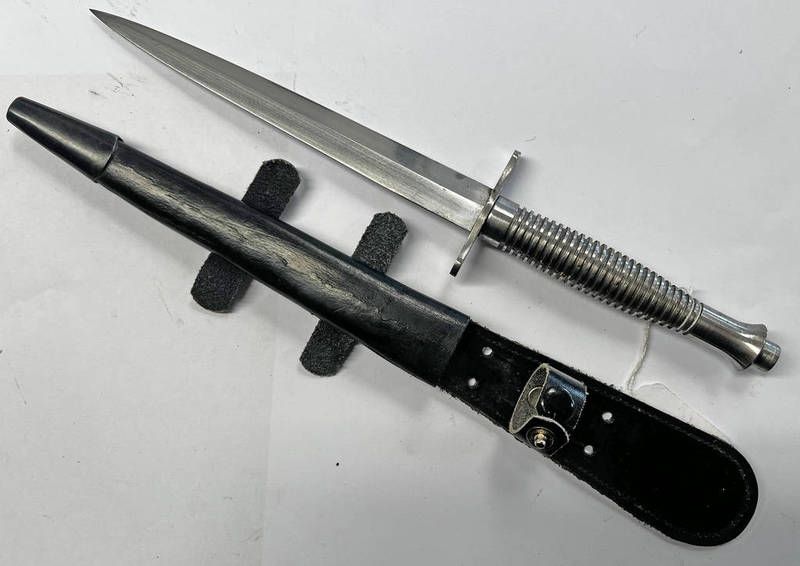 Interesting fs style fighting knife with 18.8cm long double edged blade, machine grip with it's leather & metal scabbard