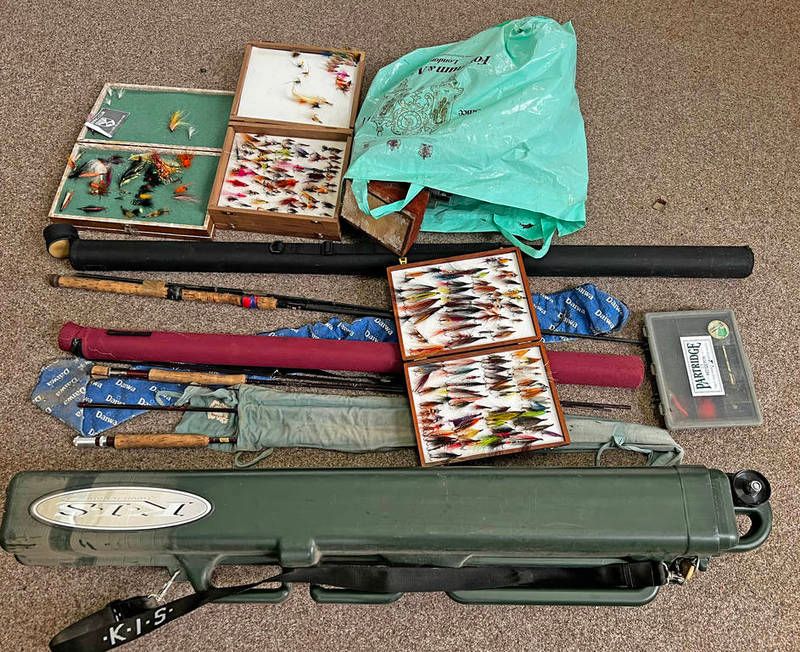 Fishing - kingsmill delphi 6/8 # 10'6'' 3 piece rod, sharpes of aberdeen the gordon 10' #7 3 piece rod, boxes containing flies etc