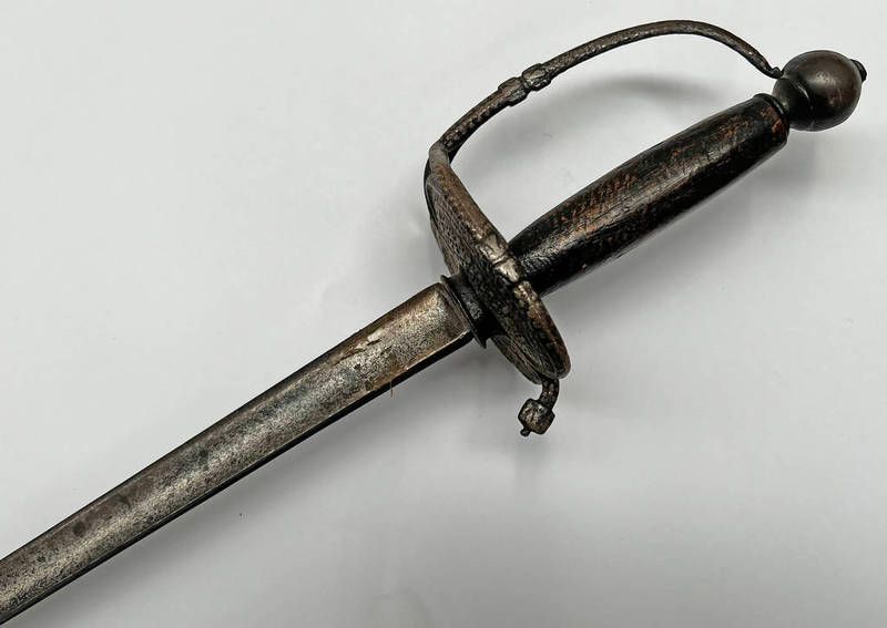 18th century single edged sword with walloon type hilt, the 75cm long style edged blade with shaped spine, iron guard with chased lattice decoration, wooden grip & a spherical pommel
