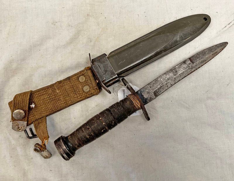 Ww2 us m4 fighting knife bayonet with 15cm long unmarked blade, cross guard stamped us m4 with its scabbard & frog