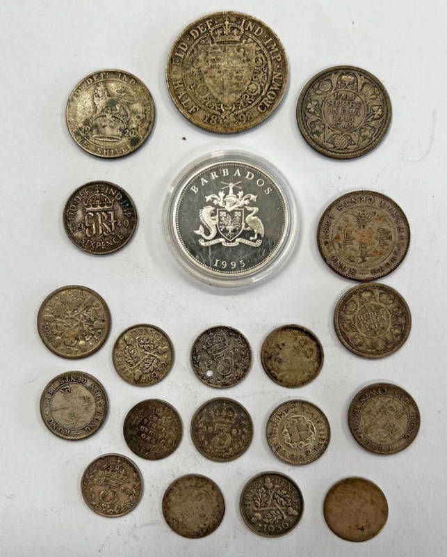 Coinage to include a 1995 barbados queen mother silver proof one dollar coin, 1898 half crown, 8.9 grams of pre 1920 silver coins, 13.6 grams of 1920-1947 silver content coins. india 1913 half rupee, 1917 1/4 rupee, 1887 2 annas, 1882 hong kong twenty cents and 1894 + 1900 hong kong ten cents