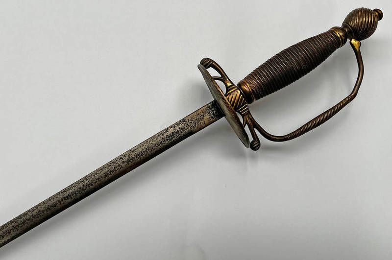 19th century small sword or court sword with gilt brass hilt, oval guard with fluted border, 75cm long double edged blade & shaped pommel