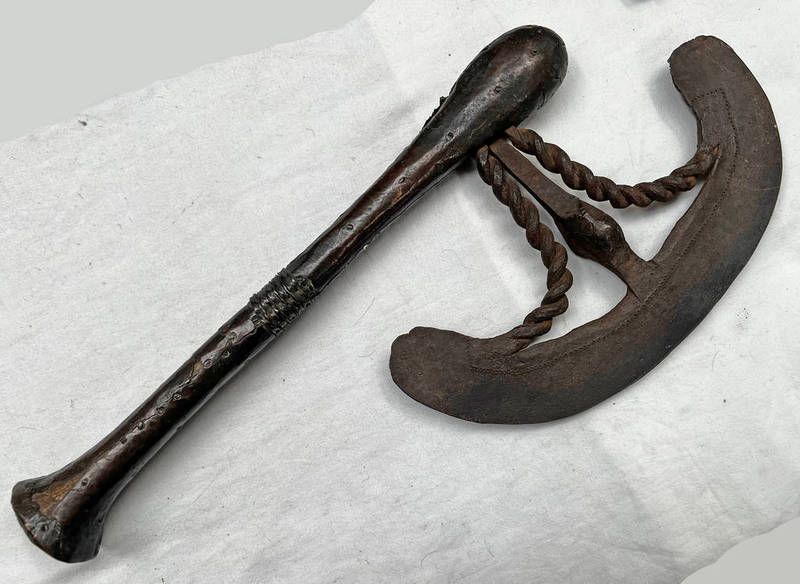 Songye axe, the metal blade with 2 heads & twist decoration, with riveted sheet copper covered handle, 42cm long