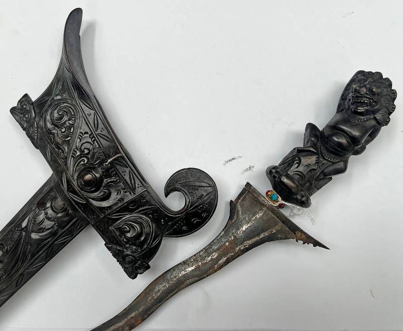 Malaysian kris with 34cm long wavy blade, figural grip and scabbard carved out of wood