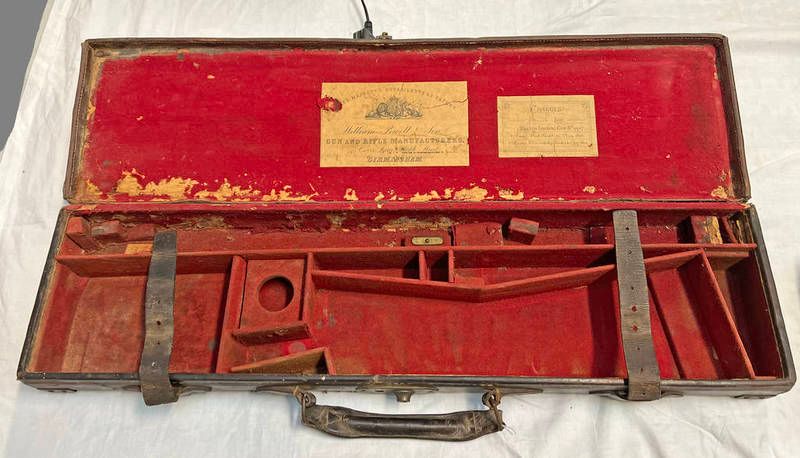 William powell & son 12 bore leather gun case, interior with william powell & son label and 12 bore breech loading gun no 9967 label .