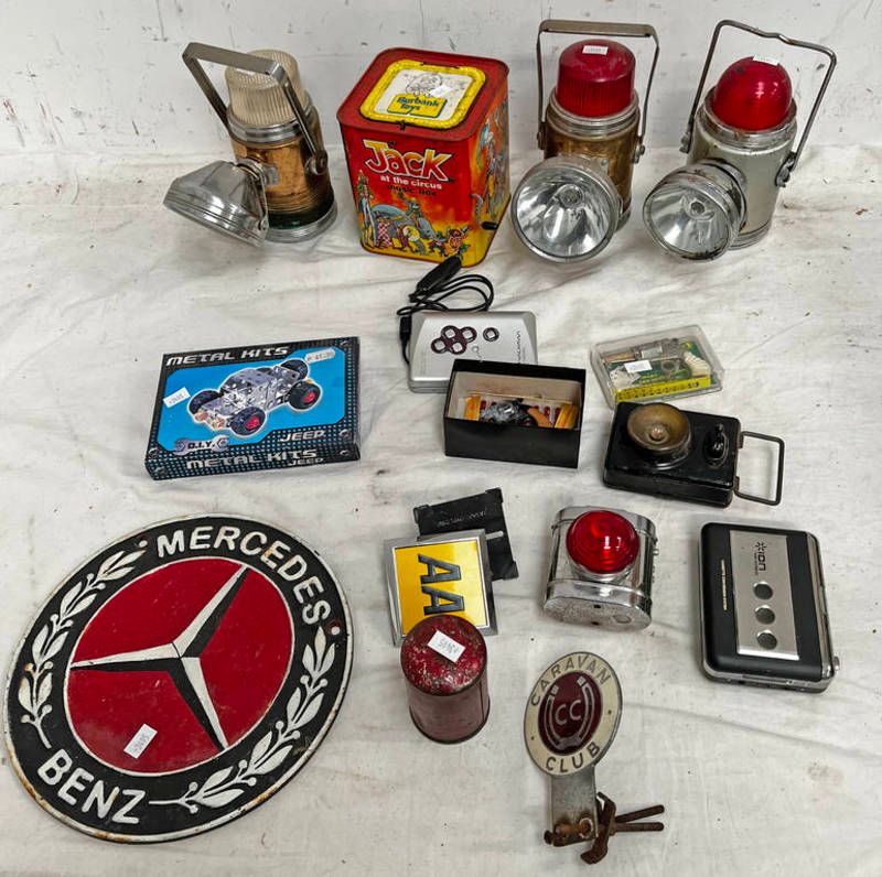 Mercedes benz cast metal plaque , caravan club car badge, aa badge, vintage bike lights / lanterns, cap gun, toys etc in one box