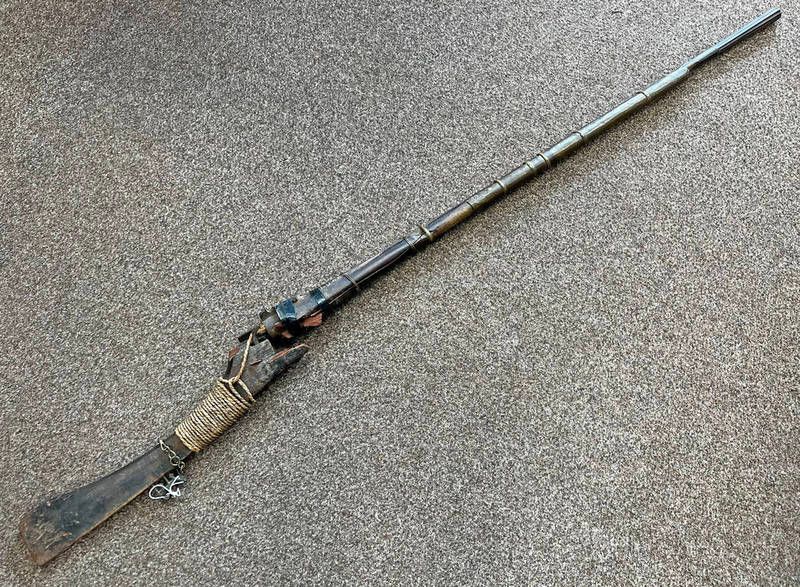 19th century arab match lock jeszail (long gun), 107 cm long ribbed iron barrel, with its wood and metal stock (af)