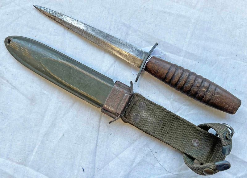 Ww2 british commando dagger with fs style 16.5 cm double edged blade, metal cross guard with its ribbed wooden grip in a usm8 bm co scabbard