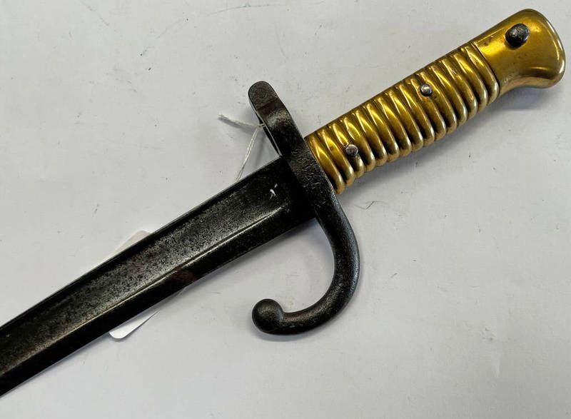 French 1866 chassepot bayonet with 57cm long blade with markings to spine, characteristic hilt with...