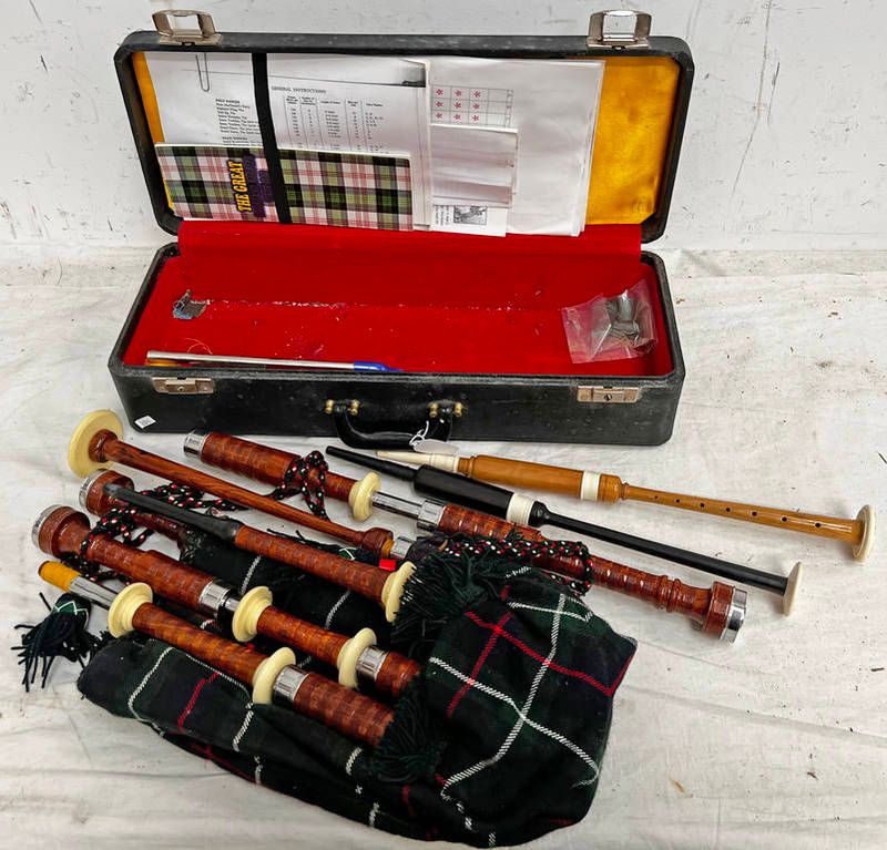 Set of bagpipes in carry case along with a piob mhor practise chanter