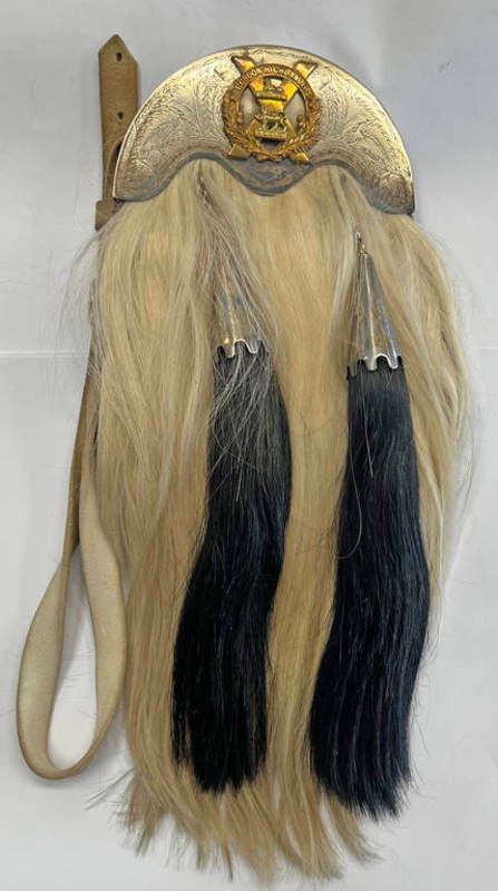 20th century gordon highlanders sporran previously belonging to captain w diack, the white metal cantle with gordon highlanders badge to front and etched thistle decoration, two tassels and a leather back marked capt w diack - captain w diack was a graduate of aberdeen university, science master at dunfermline high school. killed in action in june 1940