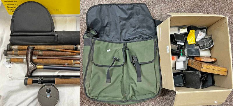 Airflo fishing bag, large selection of flies, fishing rods to include a diamond back flawless 10' 7 wt 4 piece rod in case etc.