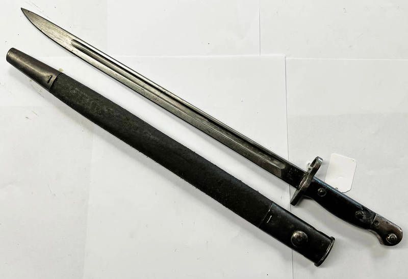 British 1907 pattern bayonet by remington & dated 8, 15, 42.5cm long blade with its steel & leather scabbard
