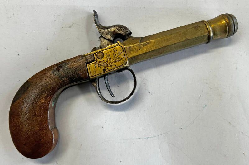 Continental brass box lock pocket percussion pistol with 87cm barrel fluted muzzle, engraved lock, steel trigger guard & wooden grip