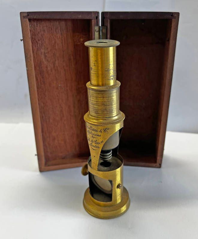 Late 19th century or early 20th century pocket field microscope by aitchison & co opticians, london, gilt brass body etched with makers name to side in its wooden case