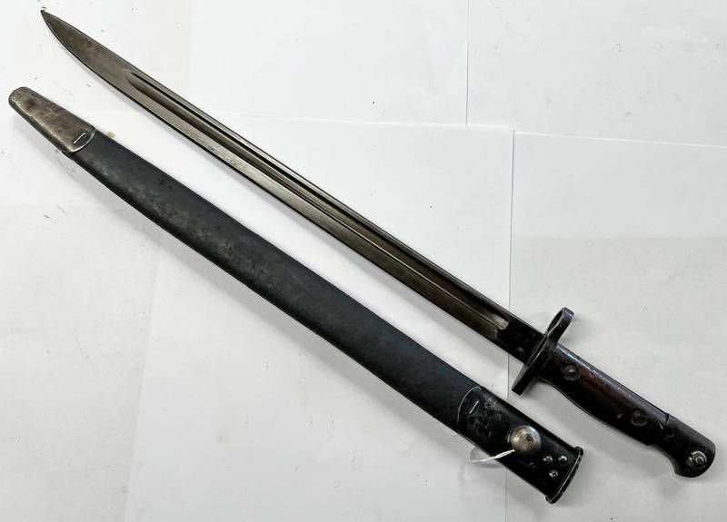 British 1907 pattern bayonet to sanderson with 43.5 cm long steel blade with several markings to include a crowned gr with its steel and leather scabbard