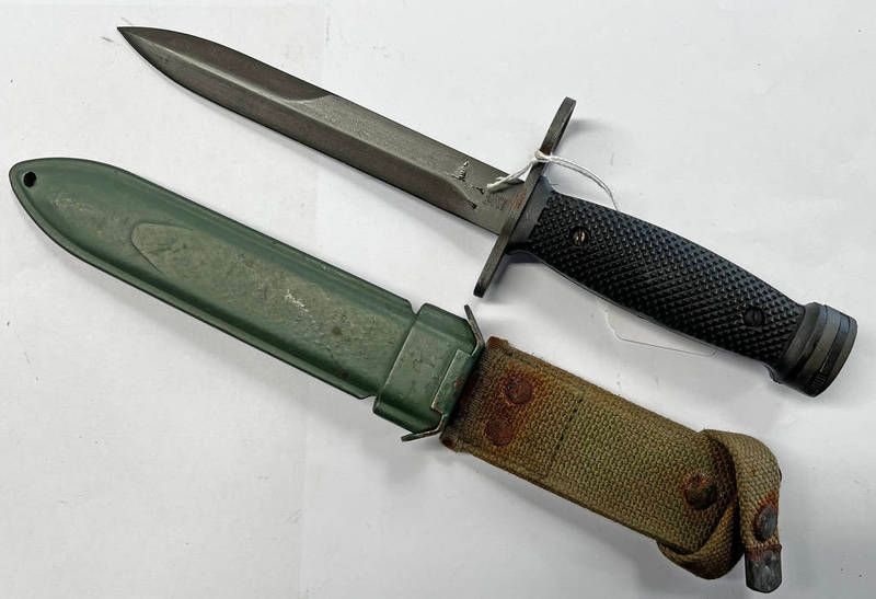 Us style knife bayonet with 16.5 cm long blade marked aet 1959, with its characteristic...