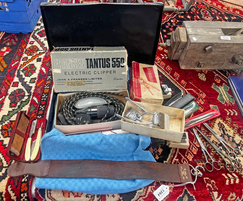 Barber matched set to include scissors, clipper, cut throat razors, etc