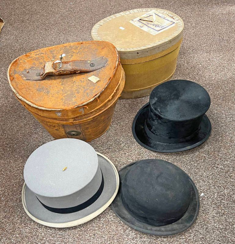 Black top hat in leather case, grey top hat in a box and one other -3-